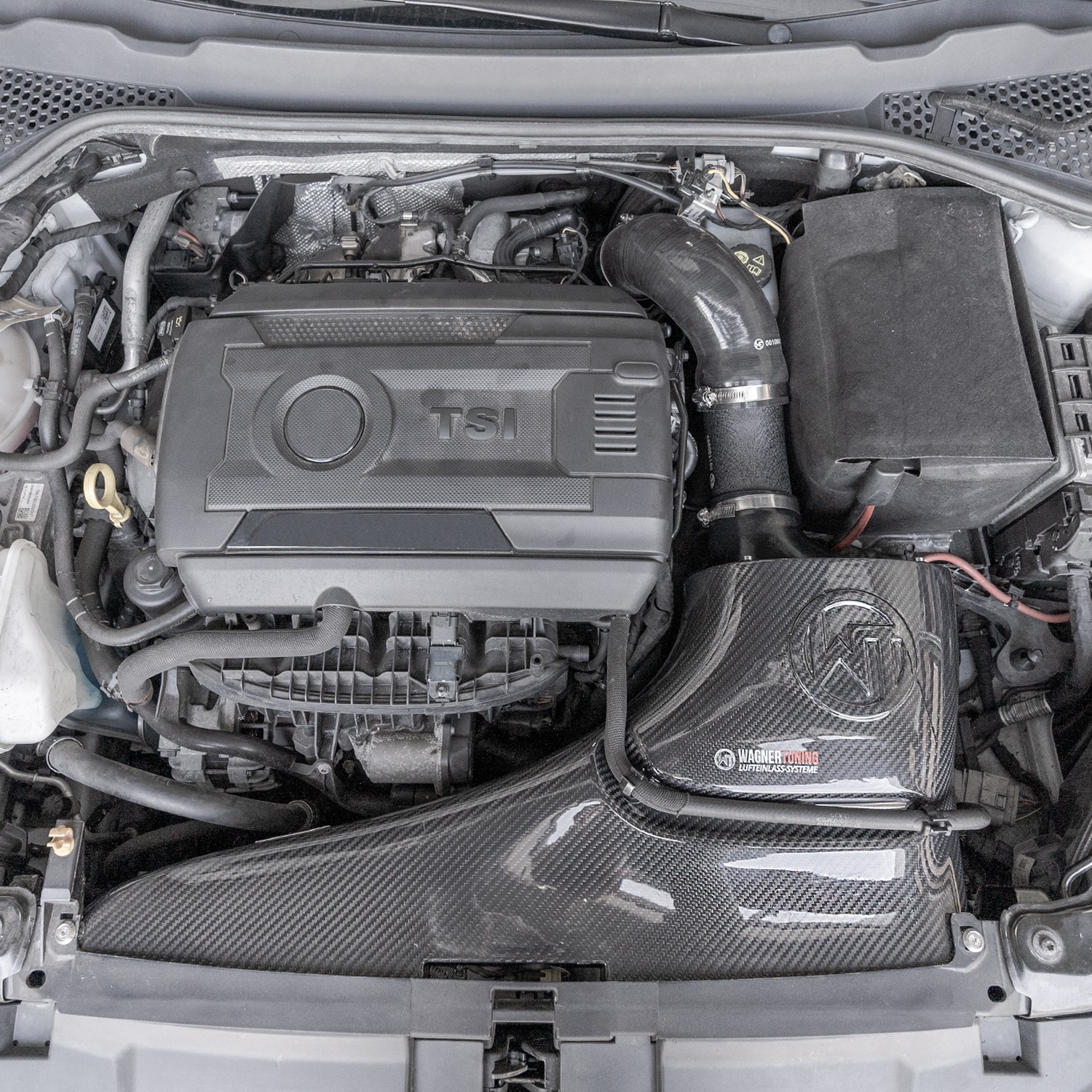 Wagner Tuning Carbon Lufteinlasssystem für VW Golf 7 GTI/R, Skoda Octavia RS & Seat Leon Cupra (2.0 TSI) – 50 % mehr Luftdurchsatz Entdecken Sie das neue Wagner Tuning Carbon-Lufteinlasssystem! Perfektion in Performance und Design für Ihren VW Golf 7, Skoda Octavia RS und Seat Leon Cupra 2.0 TSI. Als direkter Ersatz für das Seriensystem beseitigt dieses Kit Schwachstellen, optimiert die Performance und sorgt für ein einzigartiges Ansauggeräusch. Warum dieses Carbon-Intake Kit ein Muss für Ihren 2.0 TSI ist: Massive Leistungssteigerung: Durch den optimierten Luftstrom erhöht sich der Luftmassendurchsatz um beeindruckende +50 % im Vergleich zur Serie. Das Ergebnis: verbessertes Ansprechverhalten, direkter Leistungszuwachs sowie maximale mechanische Entlastung des Turboladers. Optimale Strömungseigenschaften: Die Airbox wurde mithilfe aufwendiger 3D Flow-Simulationen entwickelt. Das Ø76 mm Aluminium Ansaugrohr (mit Silikonschlauch-Anpassung) gewährleistet eine optimale Strömung bis zum Turbolader. Premium-Komponenten: Beinhaltet einen eigens entwickelten Sportluftfilter, der maximale Filterwirkung bei geringstem Gegendruck bietet Exklusives Carbon-Design: Die Carbon Airbox und das Aluminium Ansaugrohr veredeln Ihren Motorraum und setzen optische Akzente, die die Sportlichkeit Ihres Fahrzeugs unterstreichen. Einfache Plug-and-Play Installation: Das Kit ist als direkter Ersatz konzipiert und kann unkompliziert gegen das Seriensystem getauscht werden. Technische Details & Fahrzeugkompatibilität (2.0 TSI Motoren) Das Wagner Tuning Carbon-Lufteinlasssystem setzt neue Maßstäbe für maximale Leistung und ist passend für die beliebte VAG MQB-Plattform: Wagner Tuning Lufteinlasssystem: Luftmassendurchsatz: Erhöht um +50 % Anschluss Turbolader: Ø76 mm (mit Reduzierschlauch) Material Airbox: Hochwertiges Carbon Ansaugrohr: Ø76 mm Aluminium Passend für: VW Golf 7 GTI (BJ. 2013-2019): MKB: CHHB, CHHA, DLBA, CJXE, CJXG, DNUC VW Golf 7 R (BJ. 2013-2020): MKB: CJXG, CJXC, DNUE, DJHA Skoda Octavia RS 5E (BJ. 2013-2018): MKB: CHHB, CHHA, DLBA Seat Leon Cupra (BJ. 2014-2019): MKB: CJXE, CJXA, CJXH, DNUC, CJXC, DNUE, CJXG (Hinweis: geringe Anpassungen am Schlossträger nötig) Artikelnummer: 300001001 Lieferumfang: 1x Carbon Airbox 1x Ø76mm Aluminium Ansaugrohr 1x Silikonschlauch (schwarz) 1x Sportluftfilter 1x Montagematerial 1x Einbauanleitung Jetzt bestellen und mehr erfahren – Ihr Weg zu mehr Leistung und Fahrspaß! Nicht im Bereich der STVO zugelassen.